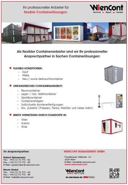 WienCont, Betreiber des Containerterminals am Hafen Wien, der zur Wien Holding gehört, erweitert das Portfolio und bietet nun sonderangefertigte Container - für flexible und mobile Lagermöglichkeiten, Produktpräsentationen oder Ausstellungsmöglichkeiten - an.